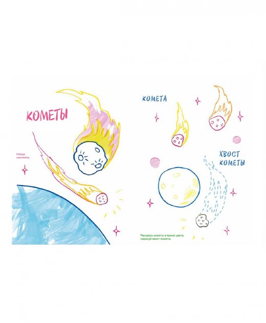 Чтобы завершить предложенные в раскраске образы, вашему малышу придется не только раскрасить планеты, спутники, космические корабли и другие объекты вселенной, но и дорисовать их, после чего вклеить на страницы стикеры с пропущенными элементами изображения.
