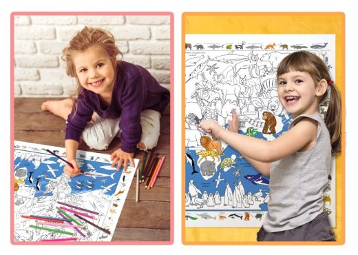 Сделайте досуг ребенка не только интересным и приятным, но и обучающим. С огромной раскраской «Карта мира – животные» это просто! Разложите карту на полу или повесьте на стену, возьмите цветные карандаши или фломастеры (чем больше цветов - тем лучше). Создайте целый цветной мир, пользуясь подсказкой по краям карты или своей фантазией.