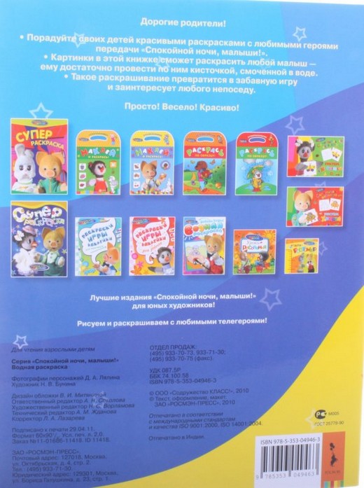 Всем знакомые любимые герои телепередачи "Спокойной ночи, малыши" порадуют малыша волшебными раскрасками! Книжки понравятся каждому ребёнку и доставят массу новых впечатлений. Ему не понадобятся ни краски, ни карандаши — только чистая вода, побольше энтузиазма и красочная картинка готова! «РОСМЭН» представляет водные раскраски лучшего качества на российском рынке. Зарубежная печать, яркие цвета. Все страницы с перфорацией по левому краю – для удобного просушивания готовой картинки и раскрашивания следующей!