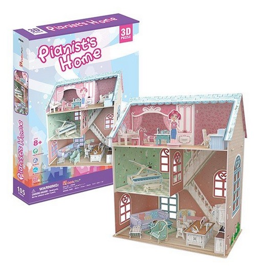 Помещение состоит из нескольких комнат, внутри которых есть все необходимое для проживания пианистки: трюмо, кроватка, стол для работы, кресла, пианино. В одной из комнат можно увидеть саму пианистку. Пазл выполнен из прочного картона, он легко собирается. Такое занятие надолго увлечет ребенка в свою сборку с головой и подарит ему массу положительных впечатлений, а также и хорошее настроение. Получившийся домик можно будет поставить на полку, как часть интерьера или как сувенир.