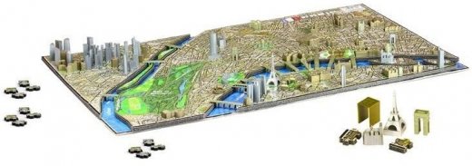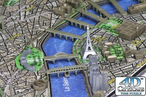 Пазл содержит такие модели икон мировой архитектуры как Эйфелева башня, Триумфальная арка, Собор Парижской Богоматери. Модели строений крепятся в специальные отверстия в 2D деталях, из которых собирается карта улиц Парижа. В комплект пазла 4D Cityscape входит буклет со схемой сборки и указателем дат возведения зданий города. Пазл 4D Cityscape Paris состоит из 1100+ деталей и содержит более 2000 образовательных фактов. Город собирается послойно, начиная с нижнего слоя, выполненного из картона с картой древнего Парижа, следом собирается 2-й слой суши, выполненный из вспененного полимера – карта современного Парижа, третий слой – модели строений.