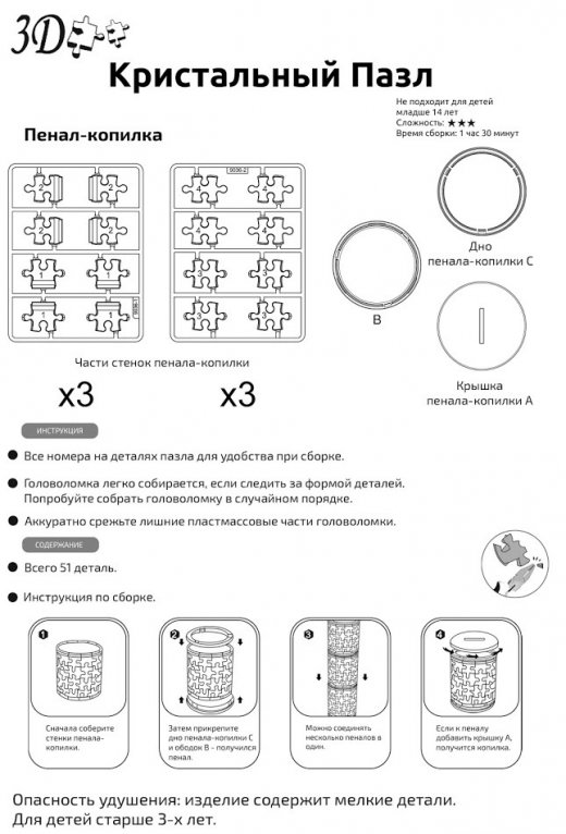 Состав набора: 51 деталь пазла, подробная инструкция.