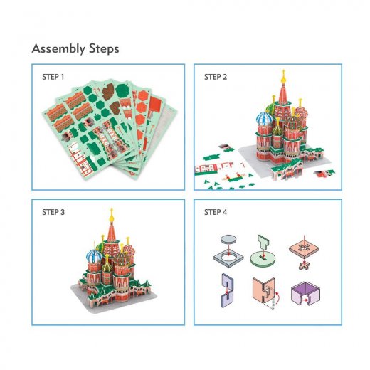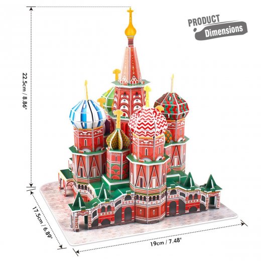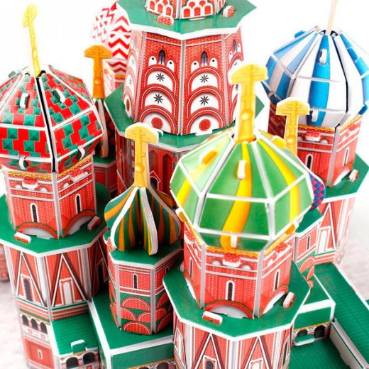 - 3D-пазл представлен 92 деталями из современного материала – плотного ламинированного пенокартона, из которых ребенок сможет собрать реалистичную и красочную 3D модель памятника архитектуры России - Собор Василия Блаженного.