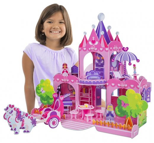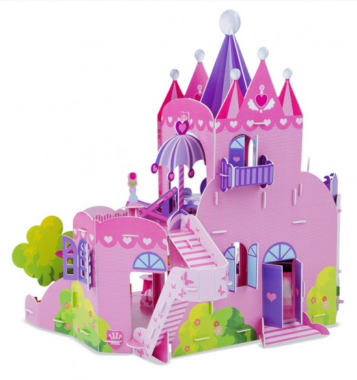 Из 100 картонных деталей 3D–пазла торговой марки Melissa & Doug собирается очаровательный кукольный домик розового цвета. Элементы не нужно вырезать и склеивать – конструкция держит форму при помощи специальных креплений. Собрать получиться не только сам домик, но и предметы мебели, фигурки и даже карету с лошадьми. А подробная инструкция поможет в этом. И вот, многоуровневый дворец для принцессы, со шпилями, дворцовым садом и даже роялем, готов к игре!