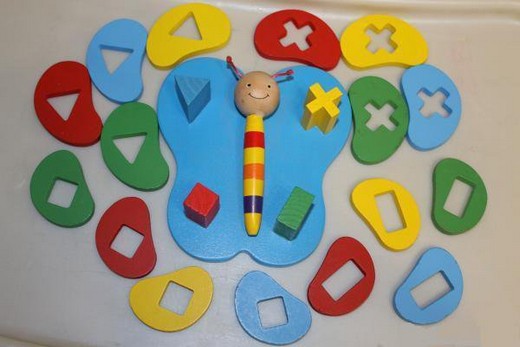Игрушки сортеры появились не так давно, но быстро приобрели большую популярность. Их еще называют самообучающими игрушками, они как бы сами подсказывают детям, как надо с ними обращаться. Малыши с удовольствием будут играть с оригинальным сортером "Бабочкой" - геометриком. На деревянной подставке лежит яркая, цветная бабочка с крылышками (два больших и два маленьких). Крылышки одеваются на штырьки, но штырьки не простые, а каждое в форме определенной фигуры: верхние в форме треугольника и креста, а нижние в форме квадрата и прямоугольника. Каждое крылышко бабочки состоит из четырех плоских фигур, внутри которых прорези, соответствующие формам штырьков. Цветовая гамма всех форм одинаковая: красный, синий, зеленый и желтый.