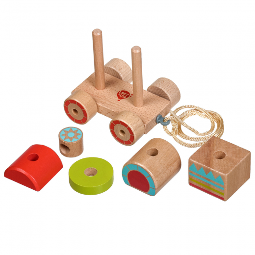 Все детали выполнены из бука - дорогой древесины с красивой текстурой. Фигурки и колесики покрыты краской на водной основе. Все деревянные детали гладкие, тщательно отшлифованы. Длина шнурка - 25 см. Основа игрушки неразборная. Колесики закреплены на металлические шурупы, такая каталка прослужит долго. Шляпки шурупов утоплены глубоко, ребенок не сможет о них пораниться.
