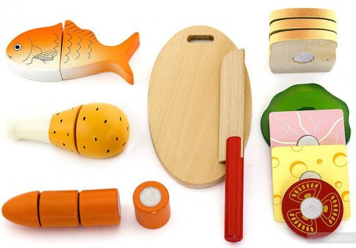 С помощью набора "Продукты дерево" можно поиграть в приготовление пищи. Детали продуктов соединены между собой липучками. Их можно разрезать с помощью входящего в набор деревянного ножа. При этом слышится хруст. Части легко соединяются обратно и можно вновь продолжать игру. Кроме того, можно предложить ребенку правильно объединить частички между собой, чтобы получились целые продукты, предварительно их перемешав.