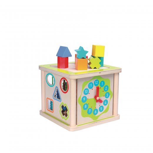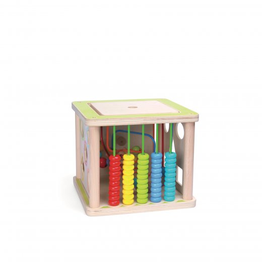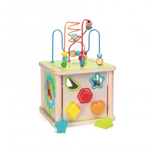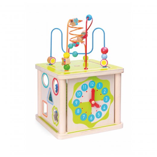 "Универсальный куб деревянный" станет отличным подарком для ребенка. Игрушка состоит из четырех основных частей: пальчиковый лабиринт, разноцветные счеты, часы, сортер.