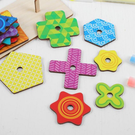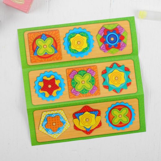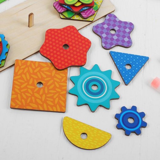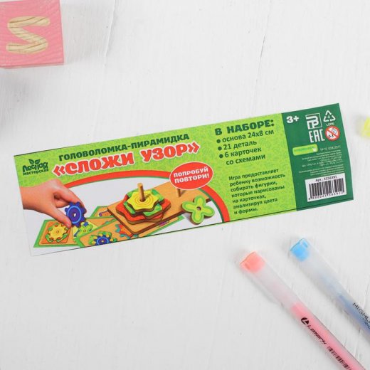 Головоломка пирамидка "Сложи узор" состоит из 21 фигуры, основания для их сбора и 6 карточек с заданиями. Суть игры в том, что бы ребенок сложил фигуры в пирамидку в определенной последовательности, предложенной на карточках-заданиях. Задания в карточках отличаются по сложности (чем выше номер задания, тем выше его сложность).