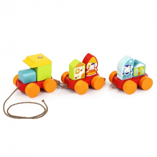 Поезд состоит из деревянных геометрических фигурок, стилизованных в виде домиков и забавных персонажей, которые можно менять местами, комбинируя их между собой по цвету. Сборка конструктора осуществляется путем нанизывания его элементов на деревянные штырьки, закрепленные на деталях-основаниях в виде шасси вагончиков. Понять, какую именно деталь необходимо разместить в котором месте, получится по рисунку-подсказке на коробке, а также по расцветке и форме самого элемента. Благодаря наличию колес игрушку получится легко катать по ровной поверхности.