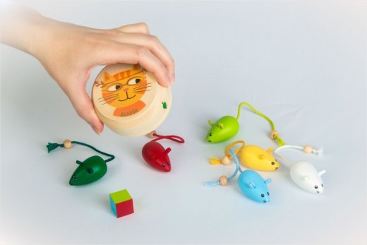 Один игрок становится кошкой – ему дается плошка и кубик. Остальные разбирают себе по 1 мышке . Игроки располагают своих мышей в центре стола группкой, держа их за хвостики. Игрок-кошка выбрасывает кубик и старается поймать плошкой мышку выпавшего цвета. Если ему это удается, игроки меняются – кошка становиться мышкой, а пойманная мышка – получает кубик и плошку кошки.