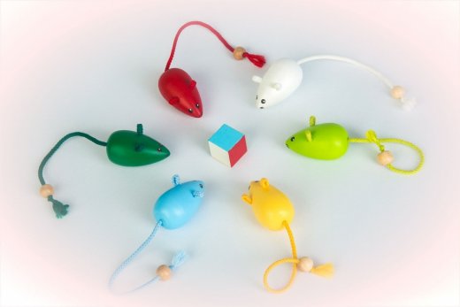 В наборе 6 мышек: зеленого, салатового, красного, голубого, желтого и белого цветов, плошка, кубик. У мышек нарисованы глазки и усики, а хвостики и усики у них из текстильных шнурочков. На донышке плошки изображен рыжий кот.