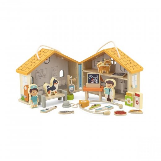 Игрушка состоит из двухэтажного деревянного строения "больница для домашних животных" с фигурками и моделями из дерева.