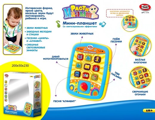 Планшет мини Расти малыш – это весьма интересное и познавательное занятие для ребенка. Развивающий планшет «Расти Малыш» - отличный подарок для любознательного познавателя мира! Уникальный дизайн и яркие цвета. Множество функций. Световые и звуковые эффекты. Играя с планшетом, ребенок узнает какие звуки издают животные, также есть много заводных и веселых мелодий, стишков. В общем, займет планшет ребенка весьма надолго и в ходе игры подарит ему массу положительных эмоций.