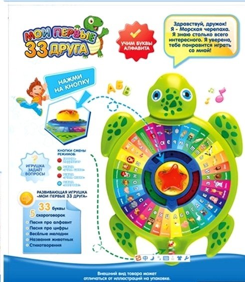 Мои первые 33 друга – это весьма интересный и занимательный подарок для ребенка. Игрушка черепашка выполнена из высококачественного, безопасного для ребенка, пластика со световыми и звуковыми эффектами. Ребенок будет крутить барабан, и узнавать много нового. С игрушкой можно просто играть и катать за веревочку, как каталку.