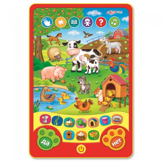 Планшетик "Веселые игры на ферме" - это 80 вопросов, загадок, логических пар, 25 говорящих картинок, 15 зверюшек, 10 песенок, 5 игр ("Чей голос? ", "Найди пару", "Сочини сказку", "Загадай – я отгадаю" и "Загадки").