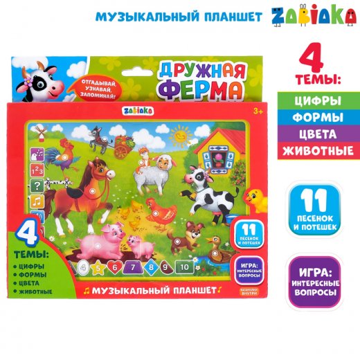 Обучающий планшет «Дружная ферма» развивает музыкальный слух, зрительное восприятие, логическое мышление и память.