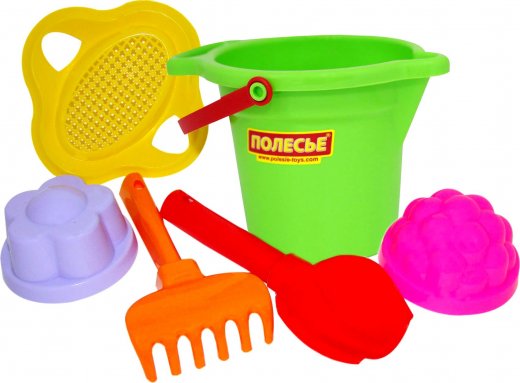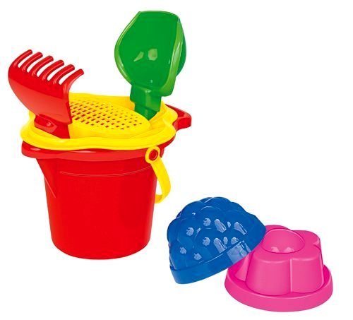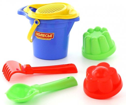 Состав набора: ведерко, совок, грабли, сито, 2 формочки.
