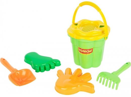 Состав набора: ведро-цветок, ситечко-цветок, лопатка, грабельки, формочки.