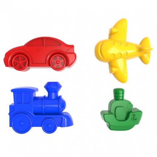 "Набор для игры в песке № 70" включает в себя 4 формочки: машинка, паровоз, кораблик, самолет.