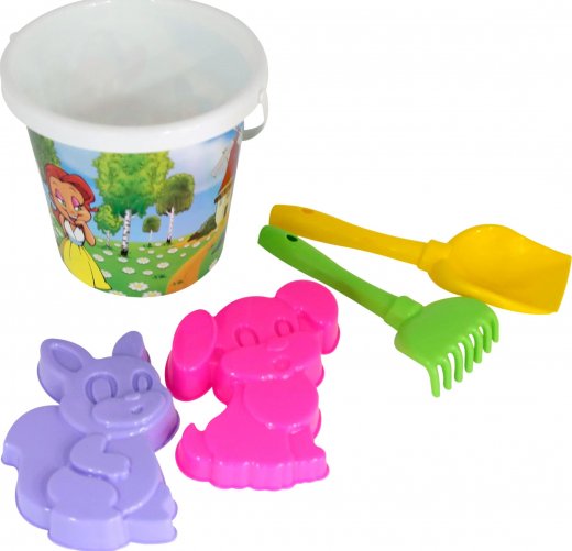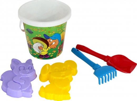 Состав набора: ведро с наклейкой, лопатка №5, грабельки №5, 2 формочки - белочка и песик.