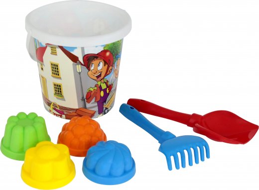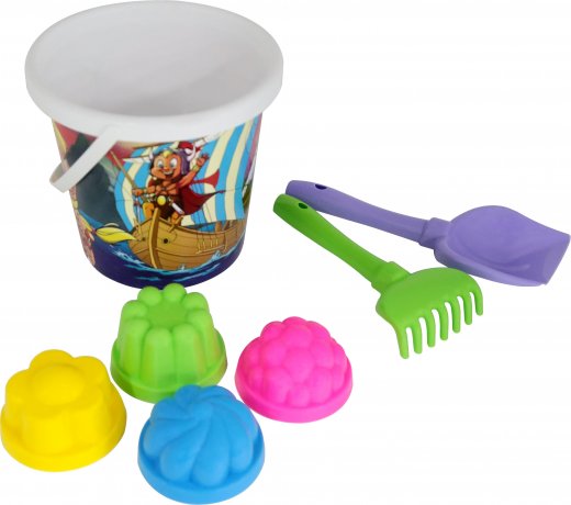 Состав набора: ведро с наклейкой, лопатка №5, грабельки №5, 4 формочки.