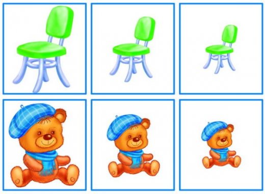 Если играет несколько детей, группы карточек с разными цветами рамок раздаются поровну. Каждый из детей подбирает по размеру свои предметы. Выигрывает тот, кто первым разложит карточки правильно и объяснит свой выбор.