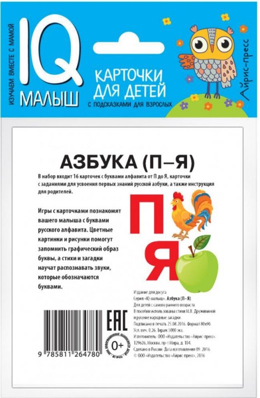 Набор обучающих карточек "Азбука от П до Я" из серии "IQ малыш" от издательства "Айрис-Пресс" предназначен для занятий с малышом с первых лет жизни. Набор включает карточки с изображением букв русского алфавита от А до П с изображением предметов и животных, чьи названия начинаются на данную букву.
