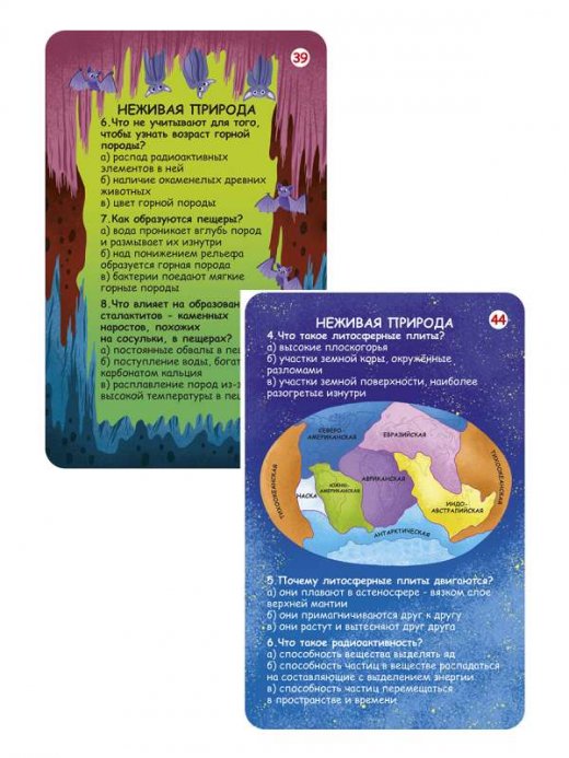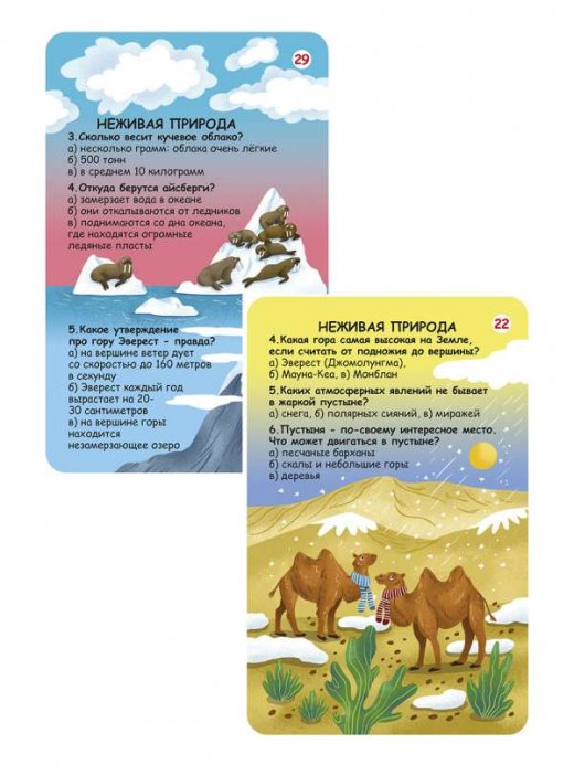 В чём особенность набора: Каждая карточка – это интересная задачка и яркая картинка. Размер карточек 15 х 11см. Благодаря удобному формату карточки можно брать с собой в дорогу. Карточки сделаны из картона и покрыты защитной плёнкой. Занятия с набором способствуют развитию внимания, памяти, логики, мышления, а также расширяют кругозор. Что найдем внутри: 50 двусторонних карточек с вопросами о живой и неживой природе, ответами и пояснениями к ним. Важно знать родителям: Набор карточек предназначен для детей от 3 лет, но также подойдет для детей дошкольного и школьного возраста и взрослых. Рекомендовано как для индивидуальных, так и для групповых занятий, а также для игр в семье, в компании и в поездках.