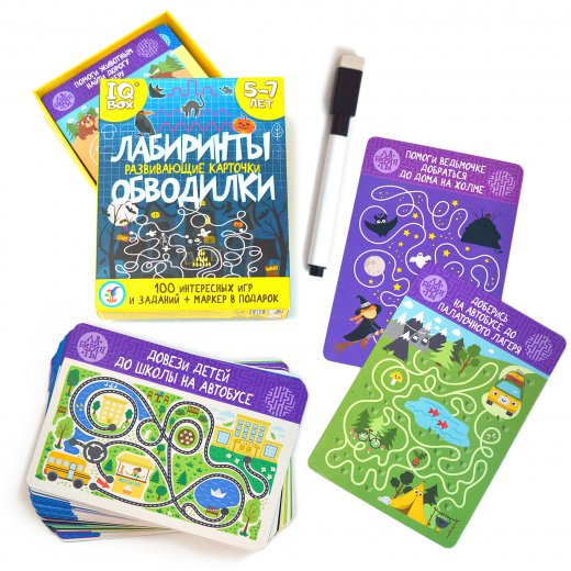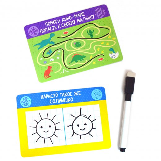 Перед вами набор из двух игр, в которых ребёнок, вооружившись маркером, будет проходить запутанные лабиринты, обводить, соединять по точкам и дорисовывать простые симпатичные картинки. Благодаря многоразовым карточкам и маркеру на водной основе можно выполнять задания снова и снова.
