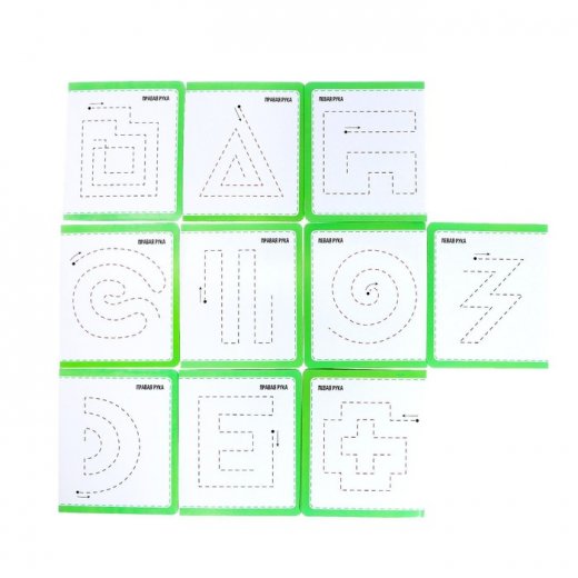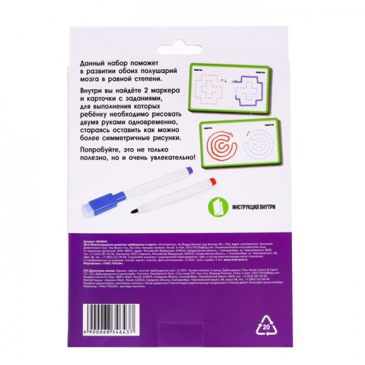 С набором пиши-стирай «Межполушарное развитие» ребёнок научится рисовать двумя руками одновременно. Игра способствует развитию обоих полушарий мозга в равной степени.