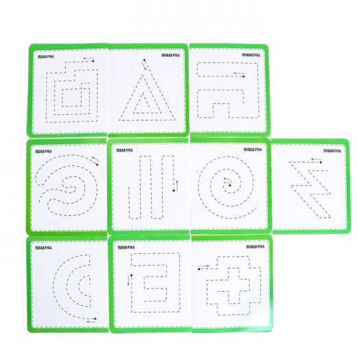 Разные цвета маркеров помогут ребёнку облегчить зрительный контроль над действиями на карточках. Начало движения отмечено на точках, а направления линий показаны стрелочками.