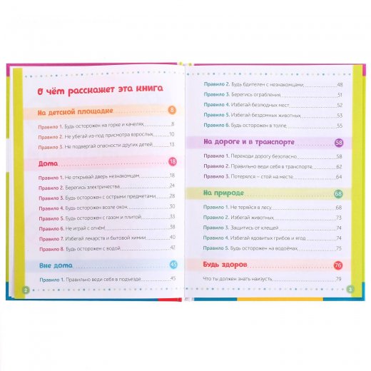 Вокруг каждого малыша раскинут огромный новый мир, полный чудес и открытий. Но, исследуя его, кроха должен помнить об осторожности. Эта книга поведает ребёнку интересные истории, которые помогут ему запомнить, как нужно и не нужно вести себя в разных ситуациях: на детской площадке; дома; на улице; на дороге и в транспорте; на природе.