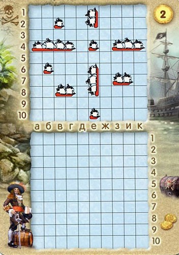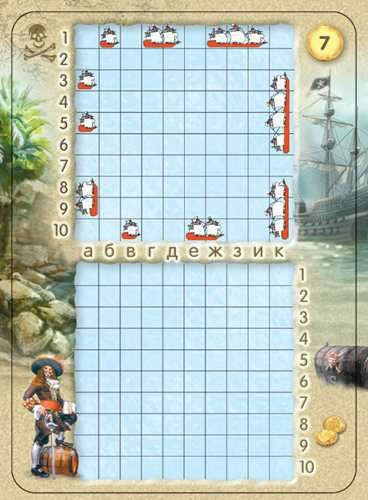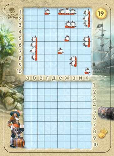 · 50 карточек, на которых приведены и симпатично оформлены 98 игровых полей с не повторяющимися комбинациями кораблей
