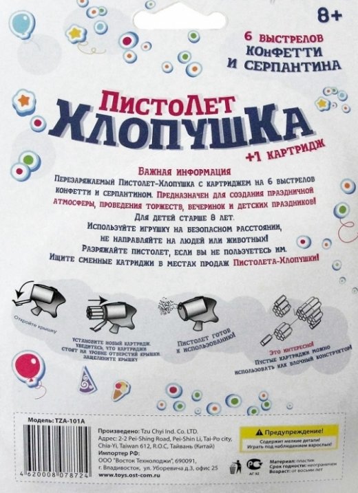 Состав набора: пистолет-хлопушка, 1 картридж.