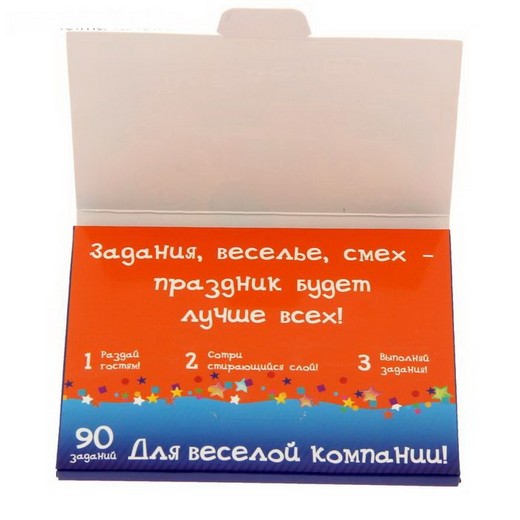 Скоро день рождения? С этим набором вы с лёгкостью развеселите большую детскую компанию! Внутри вы найдёте сразу 90 весёлых и смешных заданий для ребят. Дерзайте, праздник только начинается!