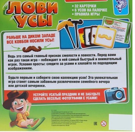 Настольная игра Лови усы - динамичная игра для настоящих ковбоев! Что являлось главным признаком смелости и ловкости на Диком Западе? Конечно усы! Мы предлагаем вернуть эту традицию. Выбирайте усы, хлопайте ими по подходящим карточкам и собирайте свою коллекцию!