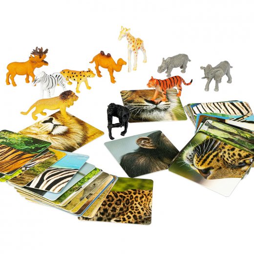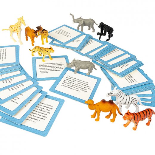 Кто-то из взрослых зачитывает информацию о животном на обороте карточки. Игрок, который быстрее всех вспомнит кто это и найдет это животное среди фигурок, и забирает карточку.