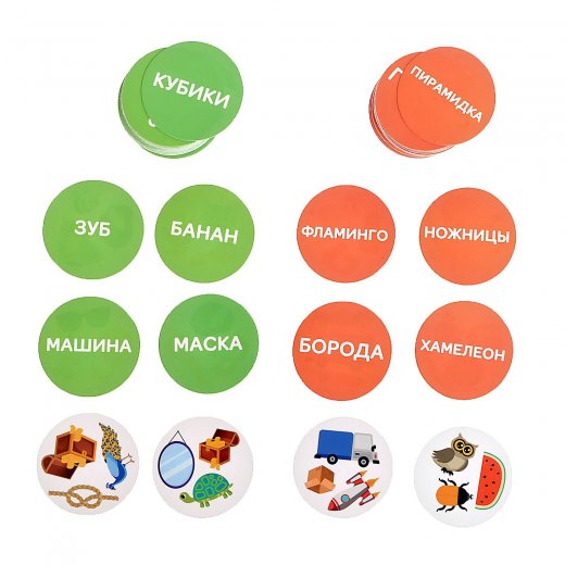 - Все жетоны лежат на столе словами вверх, а игроки смотрят на свои жетоны со стороны картинок.