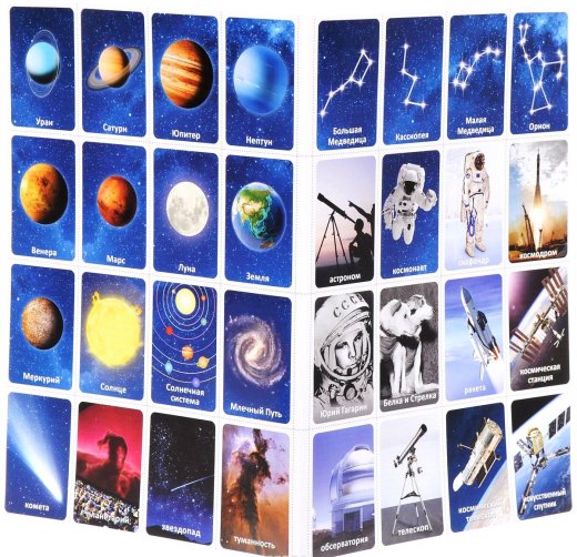 Игровые карточки, по форме и содержанию адаптированные для возраста 6+, помогут усвоить факты о космосе и солнечной системе в доступной для этого возраста форме.