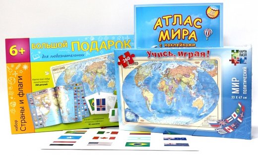 Состав набора: Карта-пазл, Атлас с наклейками, Страны и флаги, 95 наклеек, набор игровых карточек.