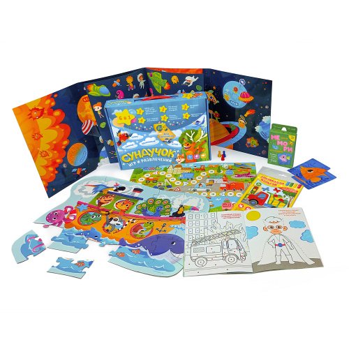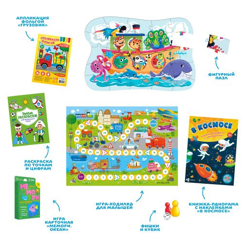 Юный герой стремится навстречу новым открытиям? Ему поможет сундучок игр и развлечений для мальчиков! Внутри - игра-ходилка, раскраска по точкам и цифрам, игра "Мемори", книжка-панорама с наклейками, "Аппликация фольгой" и фигурный пазл "Зверотур". Такой набор станет отличным помощником в тренировке памяти и внимания, познакомит малыша с цифрами и счётом и поможет сделать первые шаги в мир творчества.