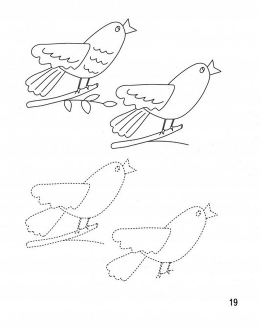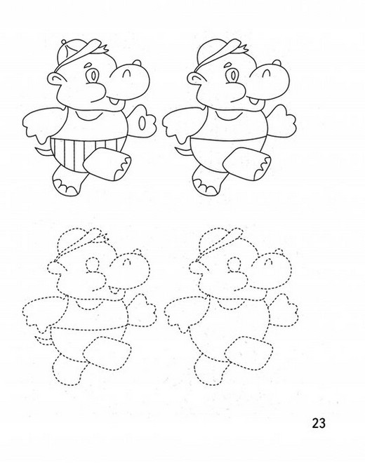 На каждом развороте предложите ребенку сначала нарисовать узоры по линиям, а затем дорисовать картинки так, чтобы они стали одинаковыми, а затем их раскрасить. Выполняйте задания последовательно, занимайтесь не более 20-25 минут, не допускайте переутомление малыша.