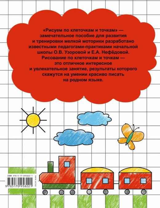 «Рисуем по клеточкам и точкам» – это замечательное пособие для развития и тренировки мелкой моторики разработано известными педагогами-практиками начальной школы О.В. Узоровой и Е.А. Нефёдовой. Рисование по клеточкам и точкам – это отличное интересное и увлекательное занятие, результаты которого скажутся на умении красиво писать на родном языке.