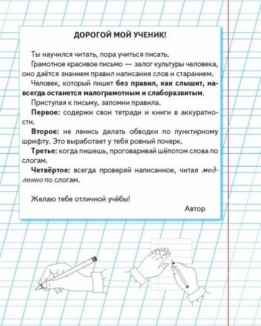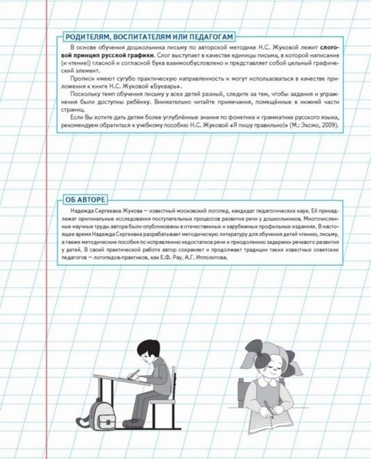 Прописи имеют сугубо практическую направленность и могут использоваться в качестве приложения к книге Н.С. Жуковой «Букварь». Поскольку темп обучения письму у всех детей разный, следите за тем, чтобы задания и упражнения были доступны ребёнку. Внимательно читайте примечания, помещённые в нижней части страниц. Если Вы хотите дать детям более углублённые знания по фонетике и грамматике русского языка, рекомендуем обратиться к учебному пособию Н.С. Жуковой «Я пишу правильно!»