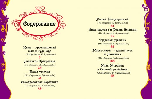 В книгу вошли самые известные и любимые сказки о русских богатырях и их битвах со злыми силами, о Кощее Бессмертном, Иване-царевиче и русских красавицах. Как это и должно быть в сказке, все заканчивается хорошо: добро побеждает, зло наказано, а гости веселятся на свадебном пиру.