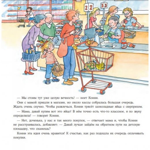 Изучили все иллюстрации? Предложите малышу рассказать, что происходит на картинках? Вот Конни стоит в очереди в кассу, что она собирается купить? А чем это Конни занимается на кухне, какое блюдо она приготовит маме? Развивайте речь и воображение ребенка вместе с Конни.