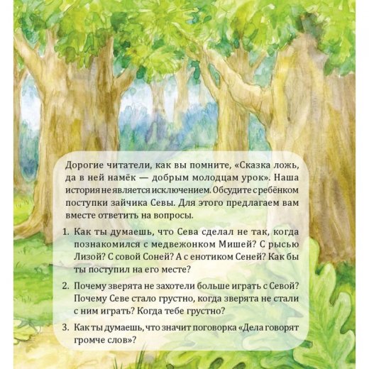 Зайчик Сева стал совсем большой, и ему пора идти в детский сад! Но Сева не хочет... А что случилось дальше, вы узнаете из сказки, поучительной и полезной. Это не просто великолепно иллюстрированные истории про непоседливого зайку и его друзей для семейного чтения, но и материал для беседы, "что такое хорошо и что такое плохо". В конце книги предлагаются вопросы, составленные детским педагогом-психологом для обсуждения с ребёнком. Книга рекомендована родителям, воспитателям, педагогам. Полезные сказки воспитывают ребёнка без крика и наказаний! В конце книги предлагаются вопросы, составленные детским педагогом-психологом для обсуждения с ребёнком.