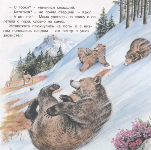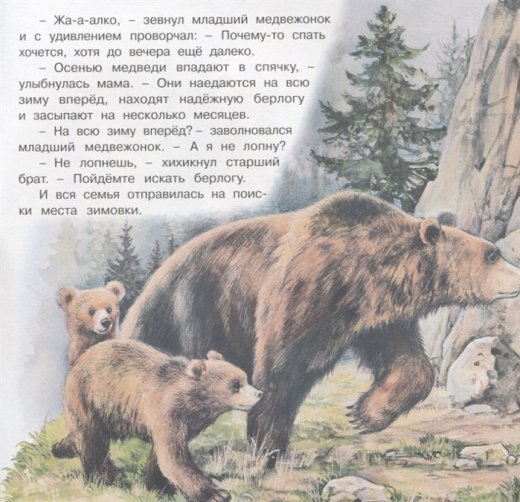 Эта книжка – интересный рассказ о жизни медвежьего семейства, мамы–медведицы и двух её медвежат. Рассказ о том, как медведица учит малышей искать лакомства, охотиться, скрываться от врагов, находить удобную берлогу, чтобы пережить суровую северную зиму.