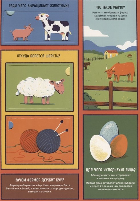 Эта книга наверняка станет одной из самых любимых у вашего малыша, ведь она не простая, а интерактивная: содержит 100 вопросов с ответами и 70 открывающихся окошек. Путешествуя по страницам книги, малыши узнают, откуда берётся молоко, как из пшеницы делают хлеб и что растёт на полях. А открывая каждое окошко, расположенное на страницах книги, дети получат ещё массу дополнительной информации, которую они непременно запомнят.